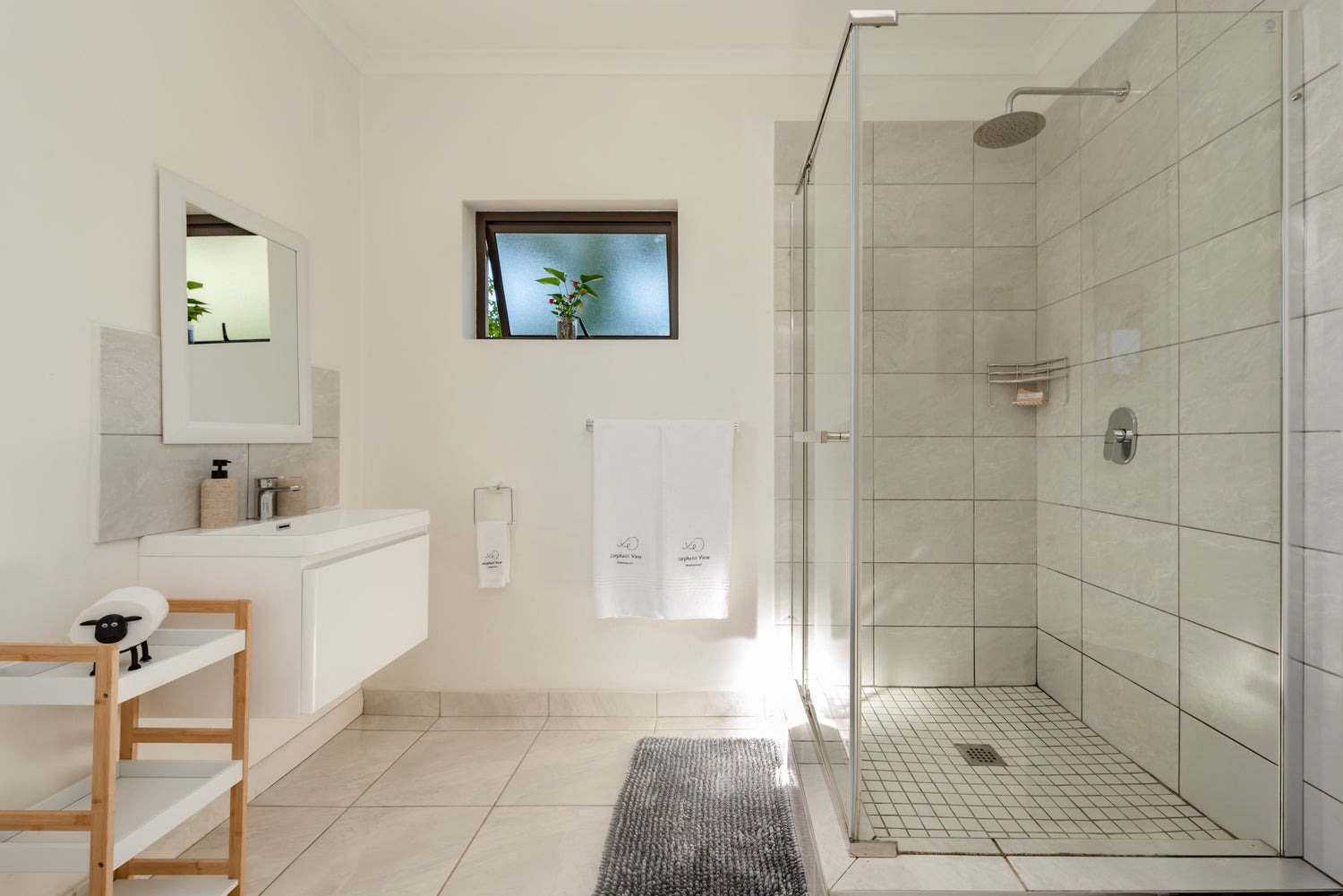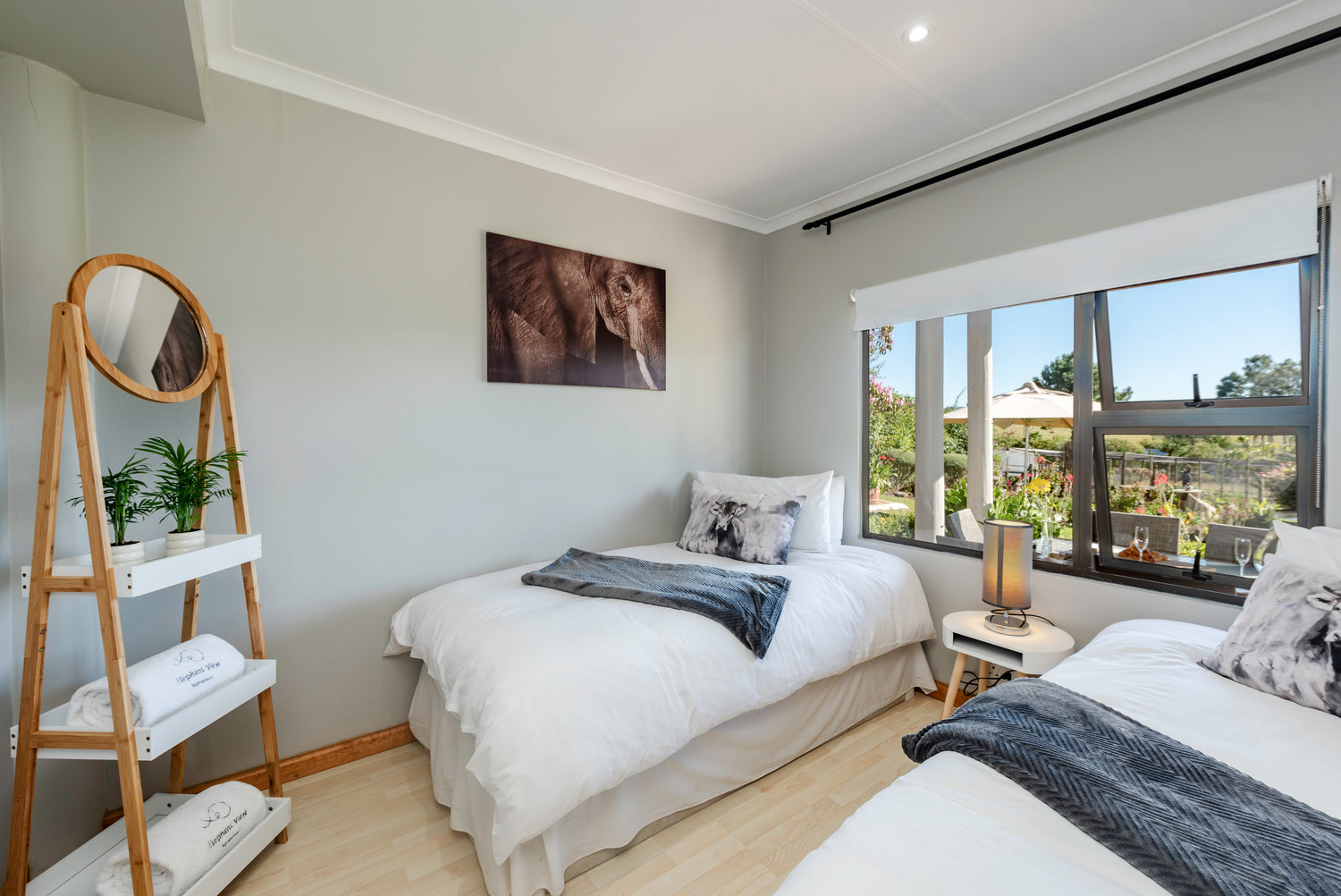 Perfect for friends or family, the twin bedroom offers two comfortable single beds, each fitted with all-weather down duvets and luxurious linen to keep you snug year-round. Enjoy peaceful rest and wake up to a stunning view of the Knysna Elephant Park just beyond your window—a truly unique and unforgettable setting.